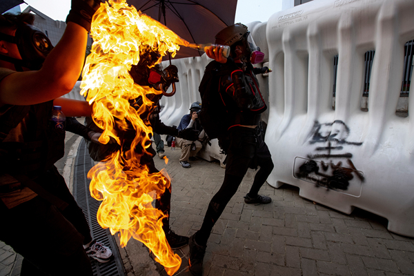消防處指斥暴徒投擲汽油彈漸成為常態。圖為一名暴徒今年9 月30日掟汽油彈襲擊政府總部。路透社