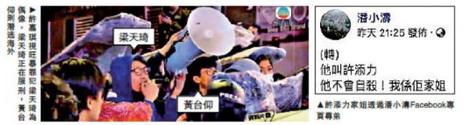 在许添力被捕当晚,曾有人自称“我系佢家姐”,透过经常为暴徒开脱的商台节目主持人潘小涛Facebook专页公开觅弟。