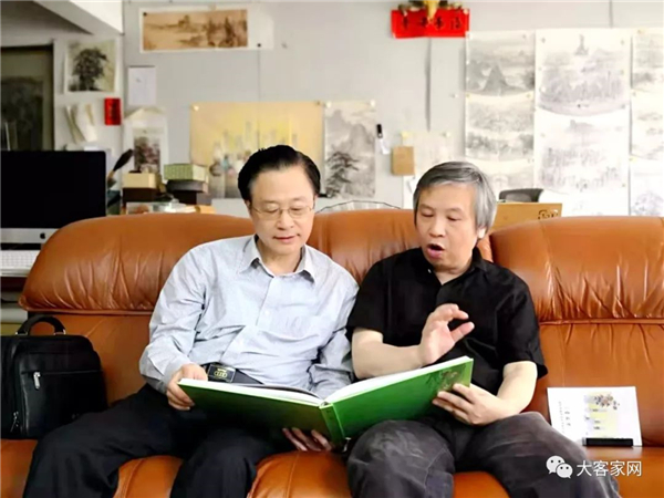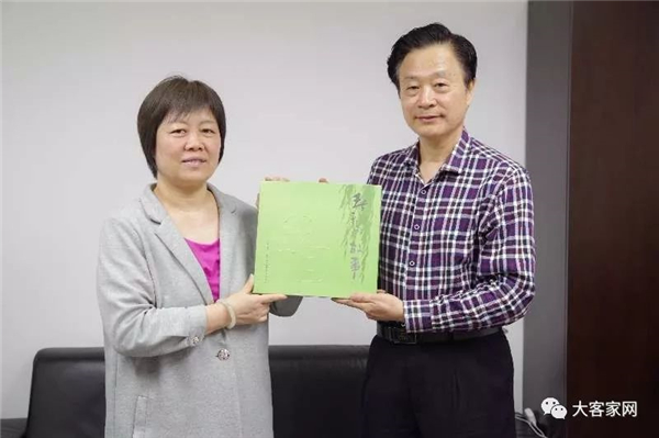 招商局博物馆樊勇馆长(左)接受采访后向杨宏海赠送资料。