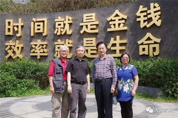 杨宏海与三位“老蛇口人”谭筑熙(左一)、诸彪(左二)、林小静(右一)在时间广场矗立的标语牌前合影(王启超 摄)
