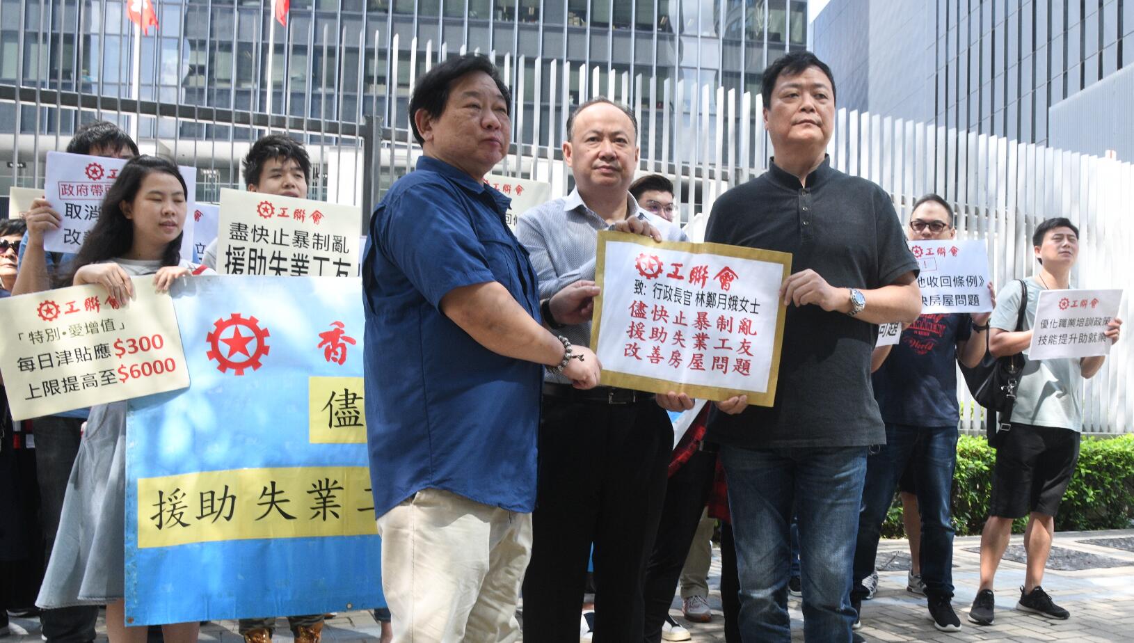 工聯會副會長唐賡堯及副理事長陳鄧源於昨早聯同多個工會代表到達政府總部,向特首遞交意見書,提出多項訴求。工聯會指出,近日暴徒到處破壞,打擊本港經濟,旅遊、百貨零售、酒店及飲食行業首當其衝,不少工人已經承受失業及開工不足之苦,預期半年內各行各業就業問題將逐步浮現,情況可能比沙士時期更惡劣,強烈要求政府為失業工友提供即時援助。