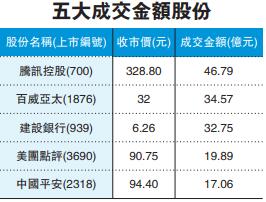 體育用品股續受追捧,李寧及安踏體育再創新高,明年是東京奧運年,體育用品股可望看高一線。新股方面表現突出,德國眼科公司德視佳(1846)首日掛牌,收市較招股價高四成六,每手帳面賺3500元。藍籌股則個別發展,中國聯通(762)跌3%表現最差;中國移動(941)亦跌0.9%。重磅股騰訊(700)330元得而復失,收報328.8元,升0.2%。豐控股(005)無起跌;友邦保險(1299)及中國平安(2318)偏軟。另外,金管局下調逆周期緩衝資本比率50點子,釋放最多3000億元額外放貸額度,港元拆息全線回落。