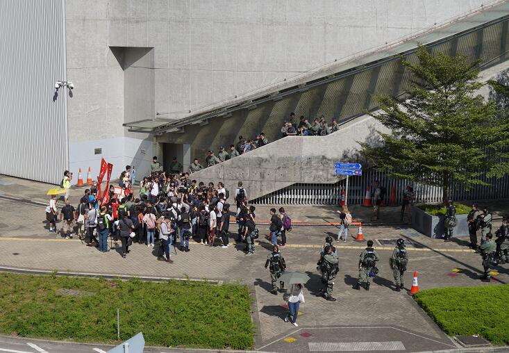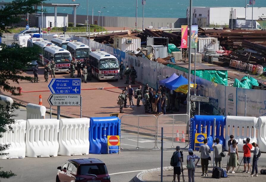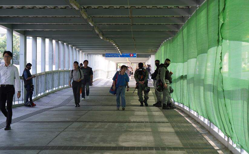 在立法會附近的港鐵金鐘站、立法會對出中信天橋及添馬公園,早上開始已有多名防暴警員戒備;有防暴警員戴上頭盔及持防暴槍巡邏,在添美道對上天橋近立法會及政府總部一邊加裝綠色紗網。
