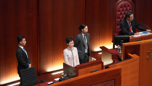 行政長官林鄭月娥早上準備宣讀《施政報告》時,多番遭泛民議員示威打斷,立法會主席梁君彥宣布休會。随后,政府宣佈,林鄭月娥改以視像方式向市民發表《施政報告》。建制派「班長」廖長江表示,反對派議員以非常危險的暴力手段,阻礙議會進行,令行政長官未能宣讀施政報告,予以最強烈譴責,並表示遺憾。