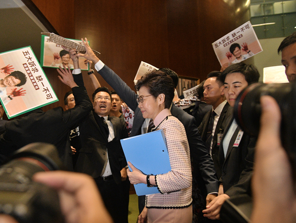 林郑离开议事厅时被反对派議員用物件攻擊。蔡啟文摄
