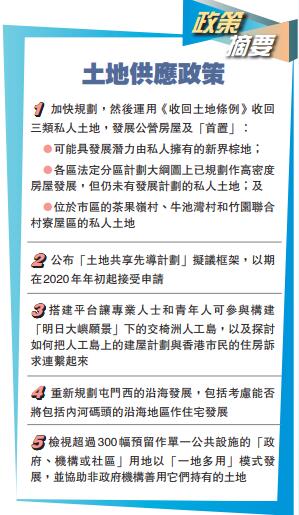 【香港商報网訊】記者鍾穎琳報道:為了滿足市民對住房殷切需求,施政報告提出以《收回土地條例》,收回三類型私人土地作百分百公營房屋(包括公屋、綠置居、居屋)及「土地共用計劃」等相關設施發展。