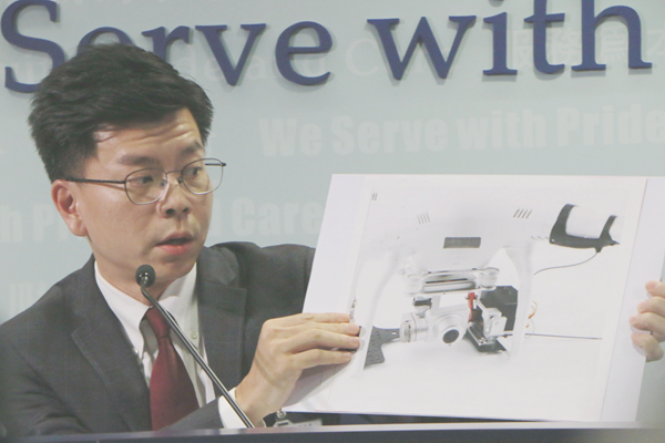 鄒旺忠警司展示在網上搜尋到的同類無人機和投擲裝置。