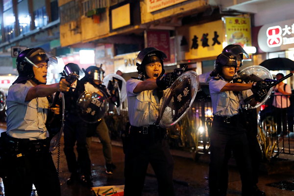 荃灣數十名暴徒持棍棒追打警員,警員向天鳴槍警告。