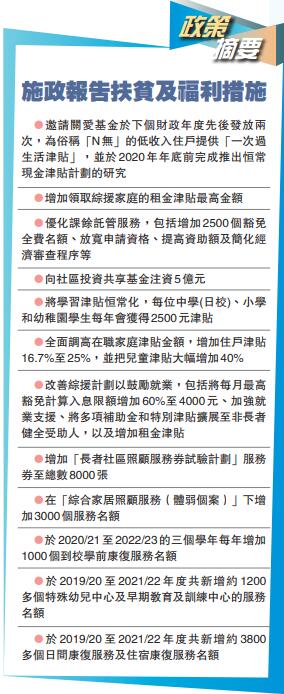 【香港商報网訊】記者周偉立報道:現屆政府一直關注基層人士的福祉,推出多項社會福利措施。林鄭月娥昨日在施政報告中提出,政府會透過現金津貼,為非公屋、非綜援的低收入住戶(俗稱:N無人士),包括輪候公屋人士,提供支援,由於有關研究工作需時,故將邀請關愛基金把原本在紓困措施中為上述低收入家庭提供的「一次過生活津貼」於下年度發放兩次,以讓政府可以在2020年年底前完成推出恒常現金津貼計劃的研究。同一時間,政府建議增加領取綜援家庭的租金津貼最高金額。