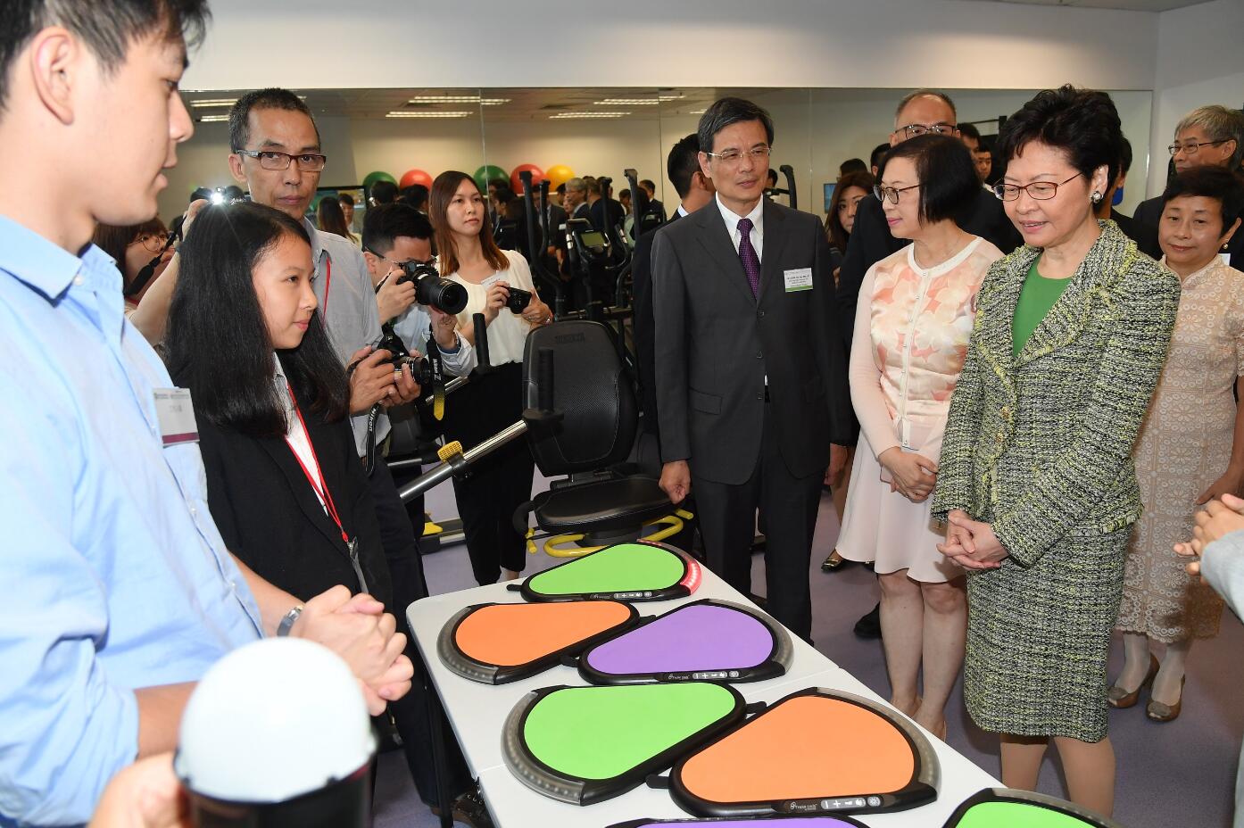 林鄭月娥(右)今年9月為葵青地區康健中心主持開幕禮後,參觀中心內設施和了解服務。