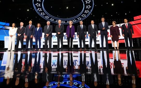 民主党人15日晚辩论现场。图源:《华盛顿邮报》
