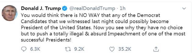 “你可以(这样)认为,我们昨晚看到的民主党候选人中的任何一位,都不可能成为美国总统。现在你看到,为什么他们别无选择,只能对作为最成功总统之一的我发起完全非法且荒谬的弹劾!”特朗普在推特上写道。
