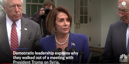 据美国有线电视新闻网(CNN)报道,当地时间16日,美国国会民主党领导人在白宫就叙利亚问题举行会议。中途走出会场后,参议院民主党领袖查克?舒默愤怒指责特朗普,称其在会上说众议院议长佩洛西是“三流政客”。