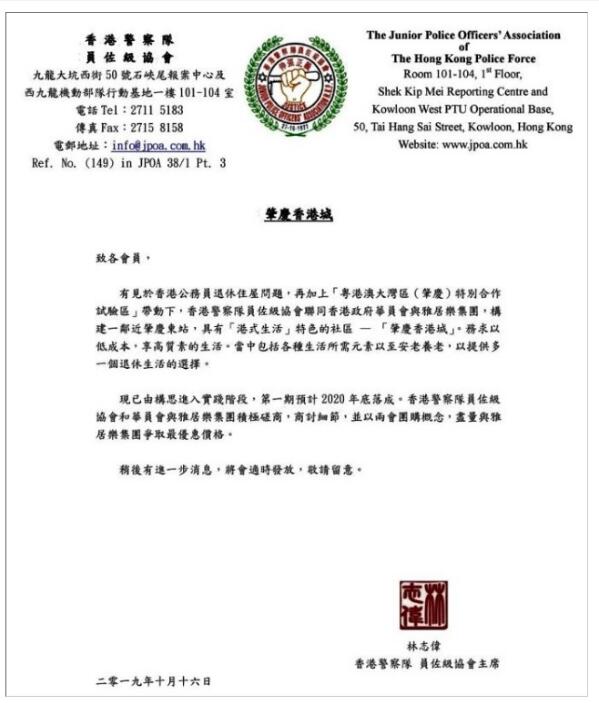【香港商報网訊】記者馮仁樂報道:香港警察隊員佐級協會主席林志偉前日(16日)向會員發信,透露協會聯同香港政府華員會向雅居樂集團商討,計劃於鄰近肇慶東站構建「肇慶香港城」,第一期預計2020年落成。林志偉表示,將以團購概念向雅居樂集團爭取「最優惠價格」,為警員及公務員提供多一個退休生活選擇。