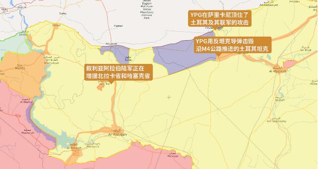 库尔德人民保卫力量(YPG)在北方边境城镇萨里卡尼顶住了土耳其及其联军的攻击,同时在M4高速公路附近发动反击,夺回了几座村庄,还摧毁了土耳其陆军的两辆坦克。