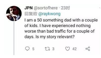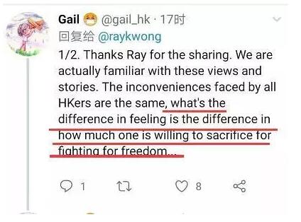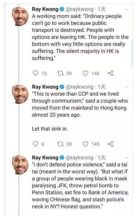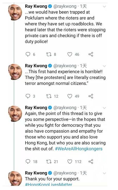 在分享完上述这些经历和观点后,Ray Kwong总结说这么做是为了给“示威者”一些不同的看待香港问题的视角,并希望“示威者”在“捍卫民主”时能够对那些支持他们的人表现出同情和怜悯,多爱一点香港,因为他们现在的做法太吓人了。