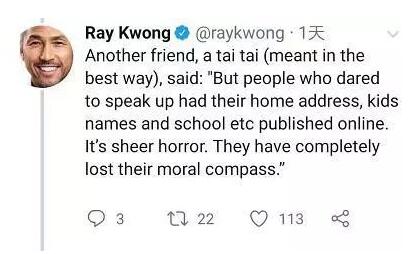 另一位Ray Kwong的太太朋友也表示,任何敢提出不同观点的人都被人在网上曝光了家庭住址,孩子的名字和所就读的学校。这是纯粹的恐怖。那些人已经完全失去了道德。
