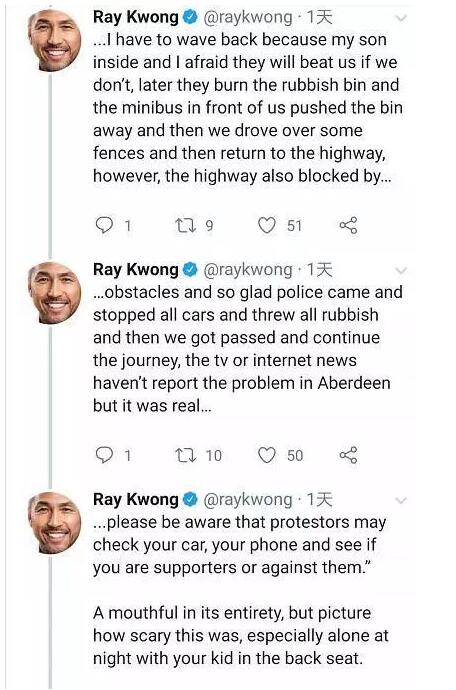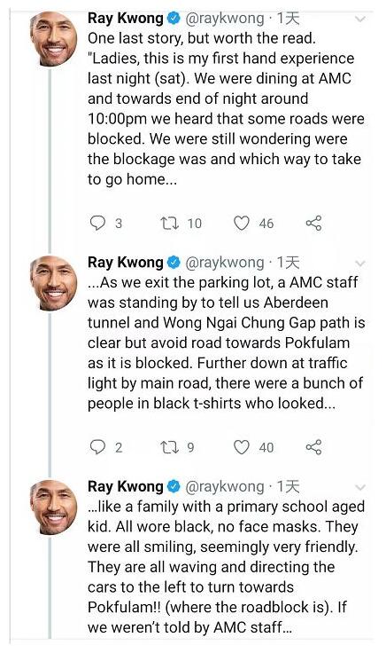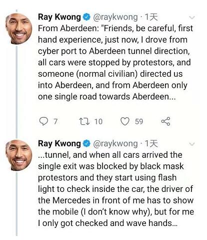 Ray Kwong还分享了两个较长的故事。第一个故事发生在香港仔地区。一个朋友表示香港仔一处隧道里所有的车都被“示威者”拦下,然后这些头戴黑面具的人还是用绍光灯检查每一辆汽车,他前面一位开奔驰的司机还被要求交出手机给他们检查。而他自己为了保护孩子不受暴力威胁,在被这些人检查后不得不向他们挥手致意。这个人还表示这些示威者还把之后的高速路也给封锁了,但幸运的是警察来了并清走了堵路的垃圾。