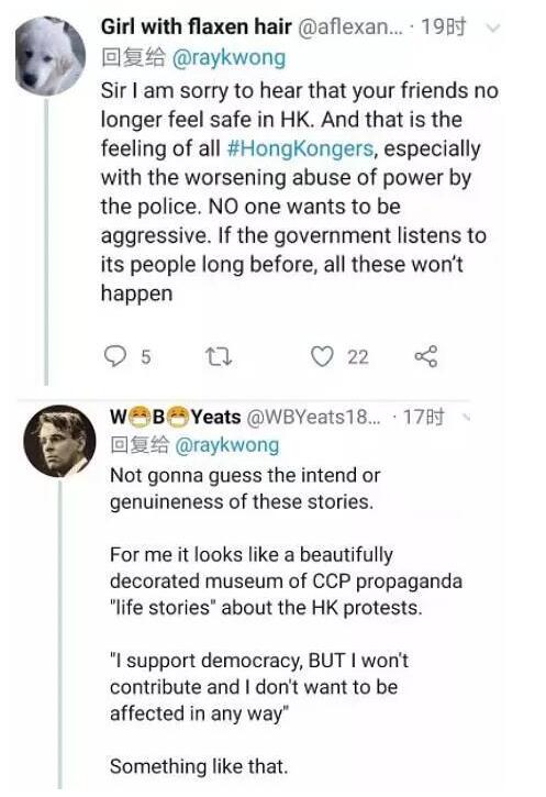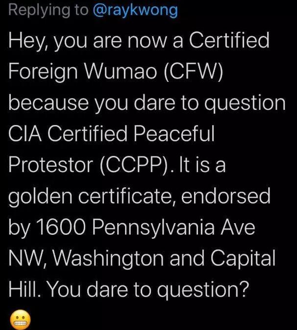 一位支持Ray Kwong的网民则调侃说“你现在已经成了被认证的外国五毛,因为你居然敢质疑这些‘被CIA认证的和平示威者’”。