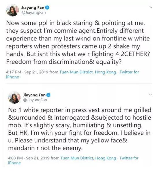 可不久前《纽约客》华裔记者樊嘉扬在遭到暴徒围堵后就曾吐槽说,她只有在跟着自己的白人朋友出行时才会被友善对待,否则就会被当成“中国人”遭到恶意对待——当然,她也因为吐槽那些“示威者”的暴力行为而同样遭到了“示威者”支持者的网络暴力,搞得好像被攻击是她自己的错一样。