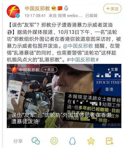 这不,前两天一个反华邪教分子跑去香港支持这些暴徒时,就被他们当成了内地人泼了油……