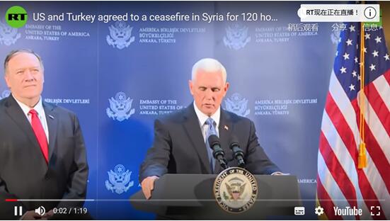 当地时间17日,美国副总统彭斯在与国务卿蓬佩奥举行的联合新闻发布会上宣布,“今天,美国和土耳其同意,在叙利亚停火(ceasefire)。”