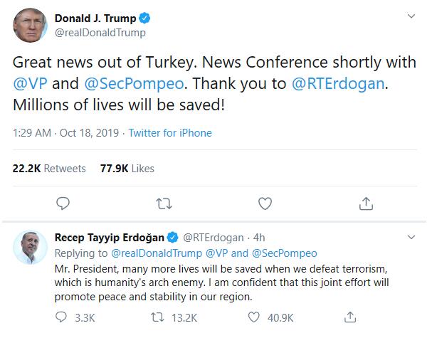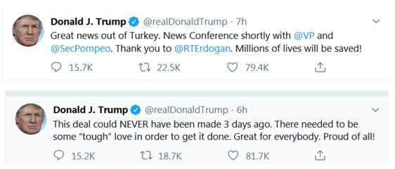 “来自土耳其的好消息。副总统(彭斯)和蓬佩奥举行了新闻发布会。感谢埃尔多安。数百万人的生命将被拯救!”特朗普还表示,“这(一协议的达成)需要一些‘严厉的’爱来完成。这对每个人都好。为这一切感到骄傲!”