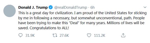 他还有一条推文说,“今天是文明的伟大日子。我为美国支持我走一条必要的、但有些非常规的路而感到自豪。多年来,人们一直试图达成这一‘交易’。数百万人的生命将被拯救。祝贺所有人!”