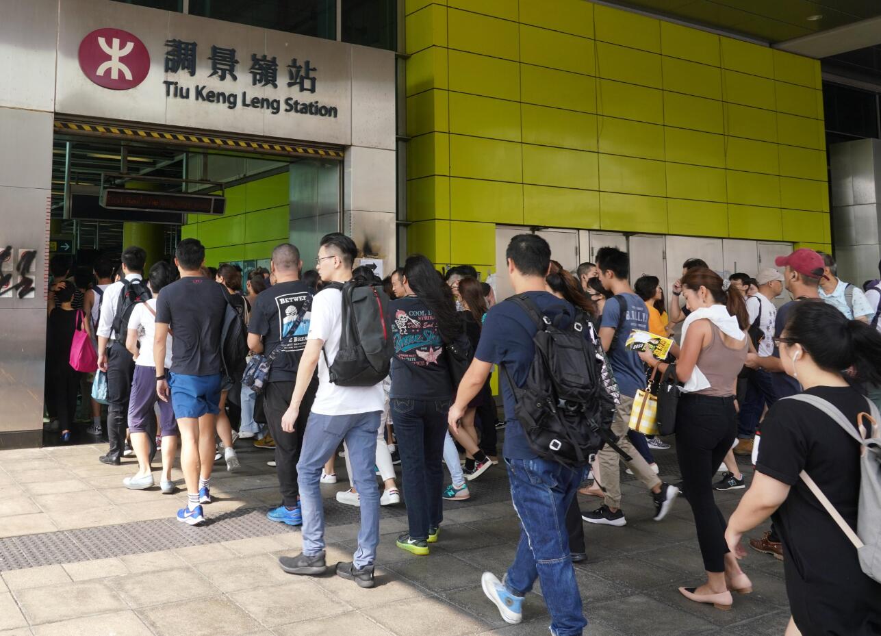 港鐵車站受破壞後,上班時段出現長龍,市民大感不 便。