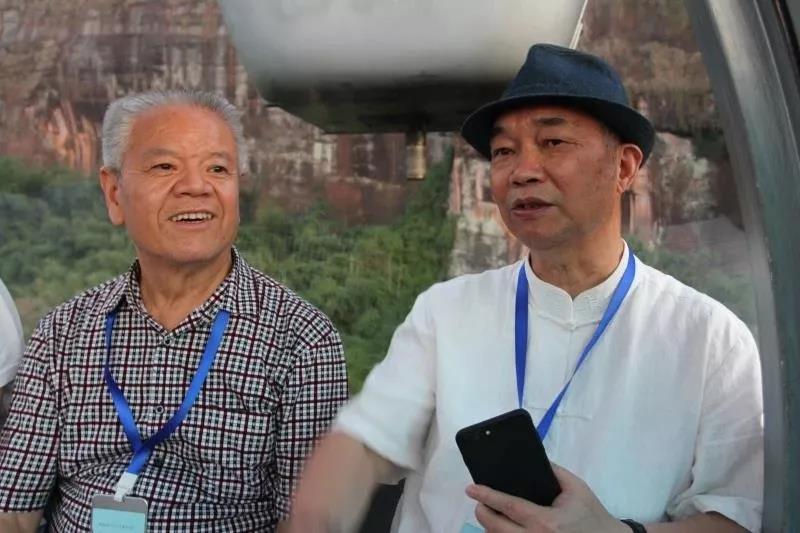 作家罗光辉(左)与王炳根乘坐缆车游览丹霞山。