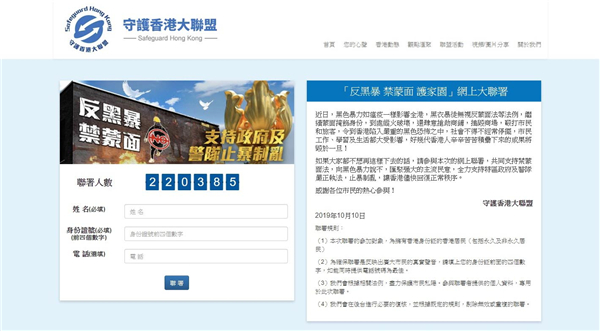 守護香港大聯盟於本月10日起,舉行「反黑暴 禁蒙面 護家園」網上大聯署行動,讓市民發聲,得以表達支持《禁蒙面法》,向黑色暴力說不的心聲,以匯聚強大的主流民意,表明支持特區政府及警隊嚴正執法,希望可以止暴制亂,讓香港盡快回復正常秩序。截至昨日傍晚,聯署已有超過22萬名市民參與聯署。