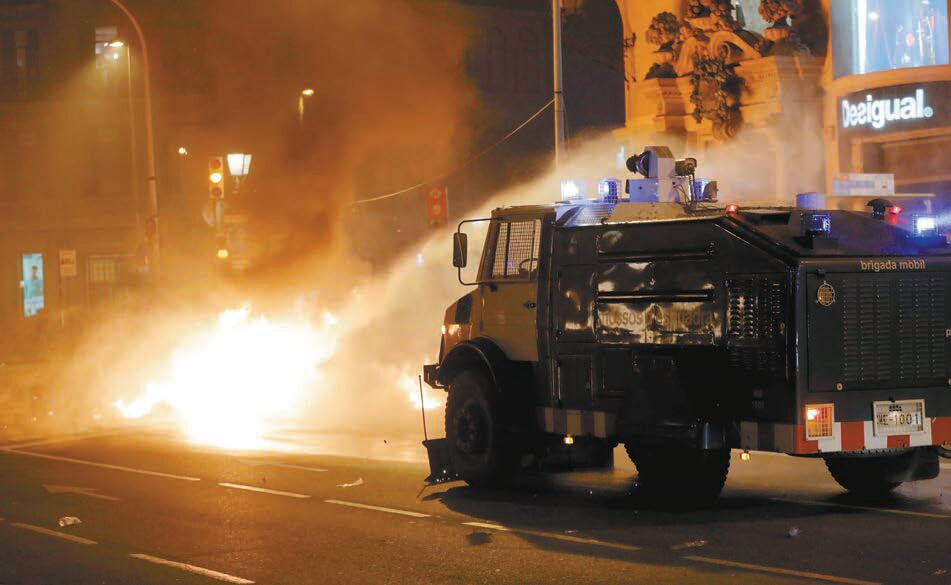 示威持續升級,當地時間10月18日晚,西班牙警方出動水炮車。路透社