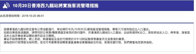 今天(10月20日)早上6时,港铁发布消息称:因公众活动,车站将于今天实施客流管理措施,乘坐高铁的乘客,请带车票及证件,从香港西九龙站D入口进站,出站则使用K出口。其他车站出入口、停车场、落客区及的士站会由车站开始运作起全日关闭。