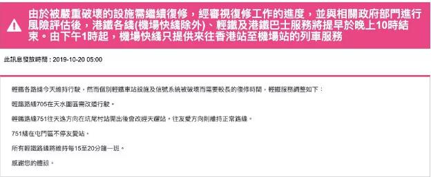 另外,今天港铁除机场快线外,各线、轻铁及港铁巴士服务将继续于晚上10时提前结束,这已经是港铁连续多日提前结束服务。