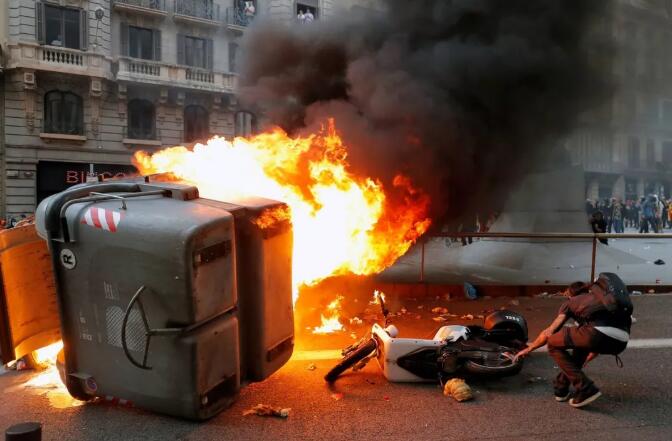 当地时间2019年10月18日,西班牙加泰罗尼亚地区发生大规模抗议和骚乱,有示威者放火点燃垃圾箱。图源:环球网