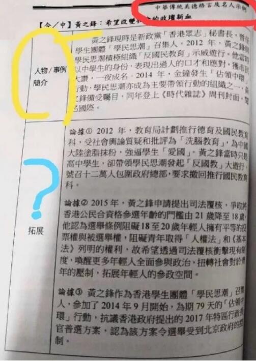 教材中更將黃之鋒煽動人「包圍政府總部」、違法「佔中」等劣行,當成其之所以被奉為「中華傳統美德名人」的論據,行文間更不乏抹黑中央政府的言論。