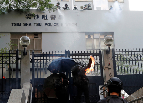 蒙面暴徒向尖沙咀警署掟汽油彈。路透社