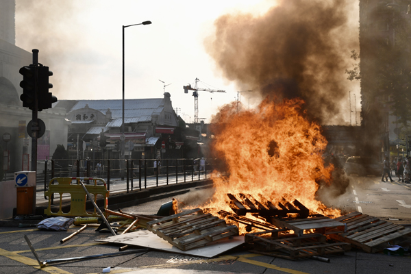 油麻地果欄外雜物被堆集焚燒。中通社