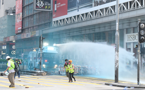 昨下午5時許,警方在旺角彌敦道及亞皆老街交界,出動水炮車噴射染色水劑驅散人群。記者蔡啟文攝