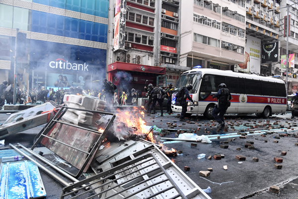 暴徒設路障阻警方追捕,彌敦道混亂如戰場。中通社