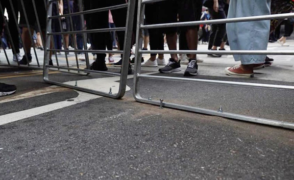 暴徒在彌敦道用石屎槍將「爆炸螺絲」釘入路面,再將鐵欄用螺絲帽鎖死,增加被清走難度。網上圖片