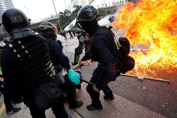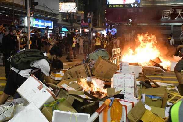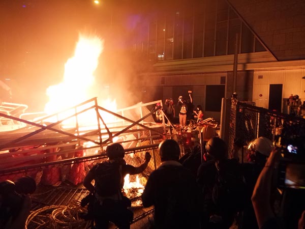 暴徒在軒尼詩道縱火燒路障阻礙警方推進。