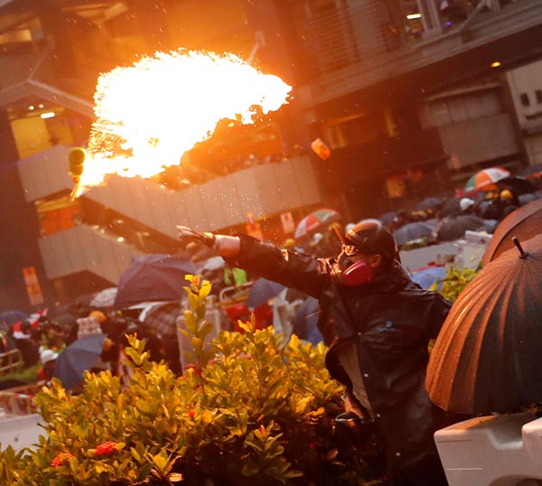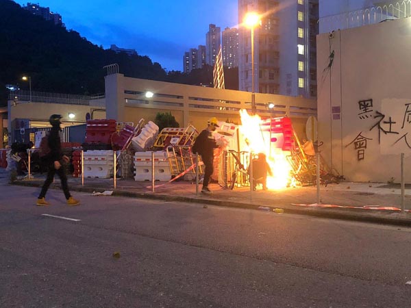 暴徒在楊屋道對峙時向警方防線投擲多枚汽油彈。