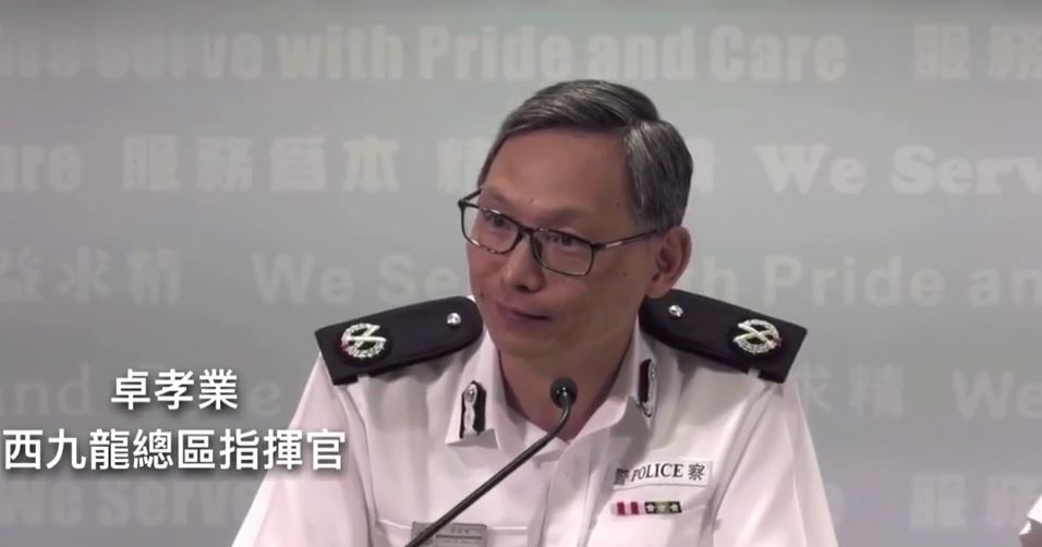 西九龍總區指揮官卓孝業說:“暴徒不僅僅是堵路,還有許多不同程度的破壞行為。其中,我認為最惡劣的是放火。消防處已經解釋過,火是很容易蔓延的,尤其在香港這種建築物稠密的地方。我們會因應現場情況安排戰術,而對於處理暴徒的手法,我並不覺得有啥問題。至於你說我們在行動中影響了一些其他人,我們已經對他們表達了歉意。”他重申:“其實,我也在迫切等待,暴徒向我們道歉!”
