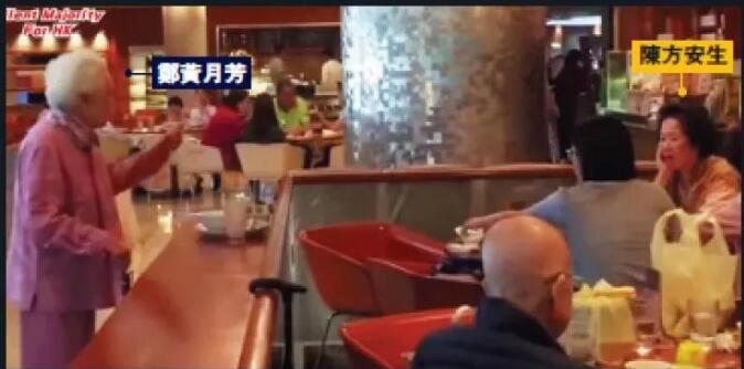 《大公報》報道稱,近日網絡上流傳一段視頻:102歲的香港婦女會會員、鄭中鈞太太鄭黃月芳在馬會餐廳內,遇到正與兩名女性友人一起用餐的陳方安生,馬上上前直斥其非。陳方安生不敢響應,擺出一副漫不經心的樣子,繼續與他人聊天。此時,視頻拍攝者不屑說道:“她還吃得下飯啊?!”並朝陳方安生喊道:“衰婆!衰婆!”