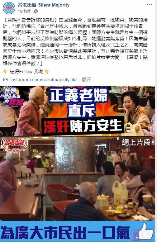 “由(香港)回歸至今,香港總有一批戀英、戀美的漢奸,他們彷佛忘了自己是中國人,常常跑到英美等國要求外國幹預香港,他們似乎忘記了英治時期的痛苦經曆!而陳方安生就是其中一個搞亂檔的人,目前的反修例發展成如今亂局,她絕對責無旁貸!因為未發展成暴力沖突時,她就連同一幹漢奸,借所謂人權及民主之名,向美國乞求幹預中港內政!不少市民都憎惡此等漢奸,有正義老婦在餐廳上巧遇陳方安生,隨即連珠炮發地直斥其非,而拍片者更大問:“衰婆!點解你仲食得落飯?(衰婆!為什么你還吃得下飯?)”