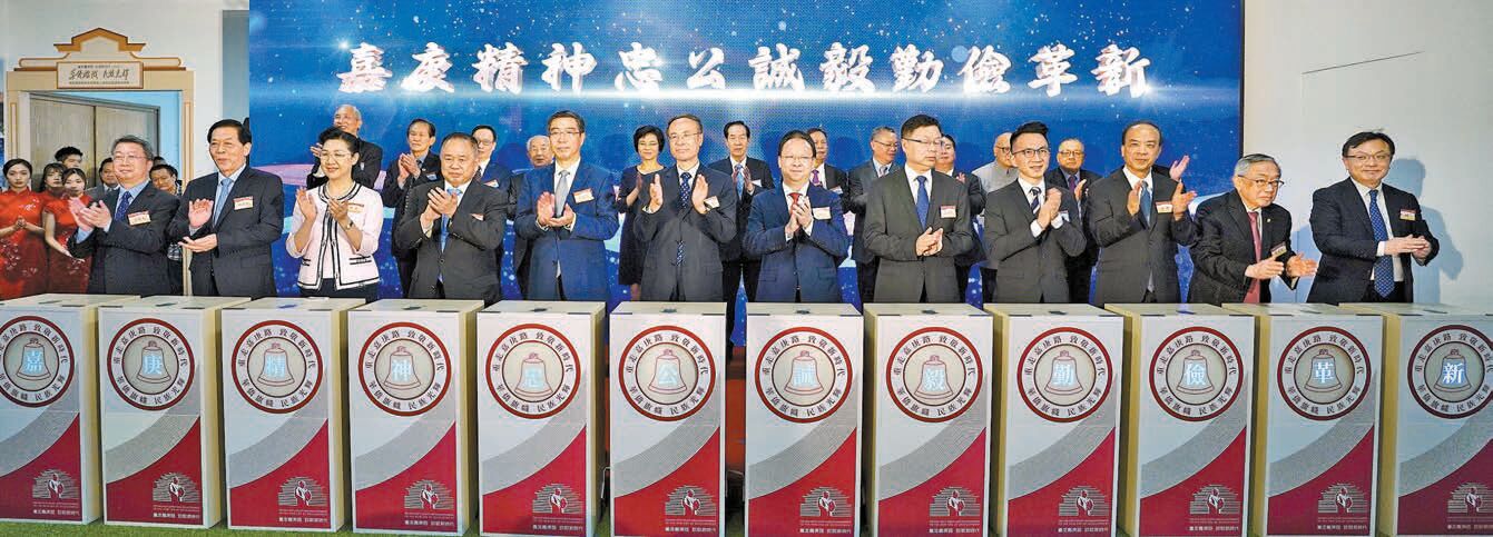 儀式邀請了中聯辦副主任譚鐵牛,中國僑聯主席萬立駿,全國政協常委、中國僑聯副主席余國春等人擔任主禮嘉賓。余國春致辭表示,陳嘉庚是傑出的愛國僑領、實業家、教育家和社會活動家。他雖然身居異鄉,卻時刻心懷家國,用畢生的熱誠傾資興學。他又指,他不僅大力興辦學校,而且也嚴格選擇師資人才,以提高教育質量,這樣的教育理念具有劃時代的目光和遠見,更對今天身陷暴力漩渦中的香港具有現實指導意義。