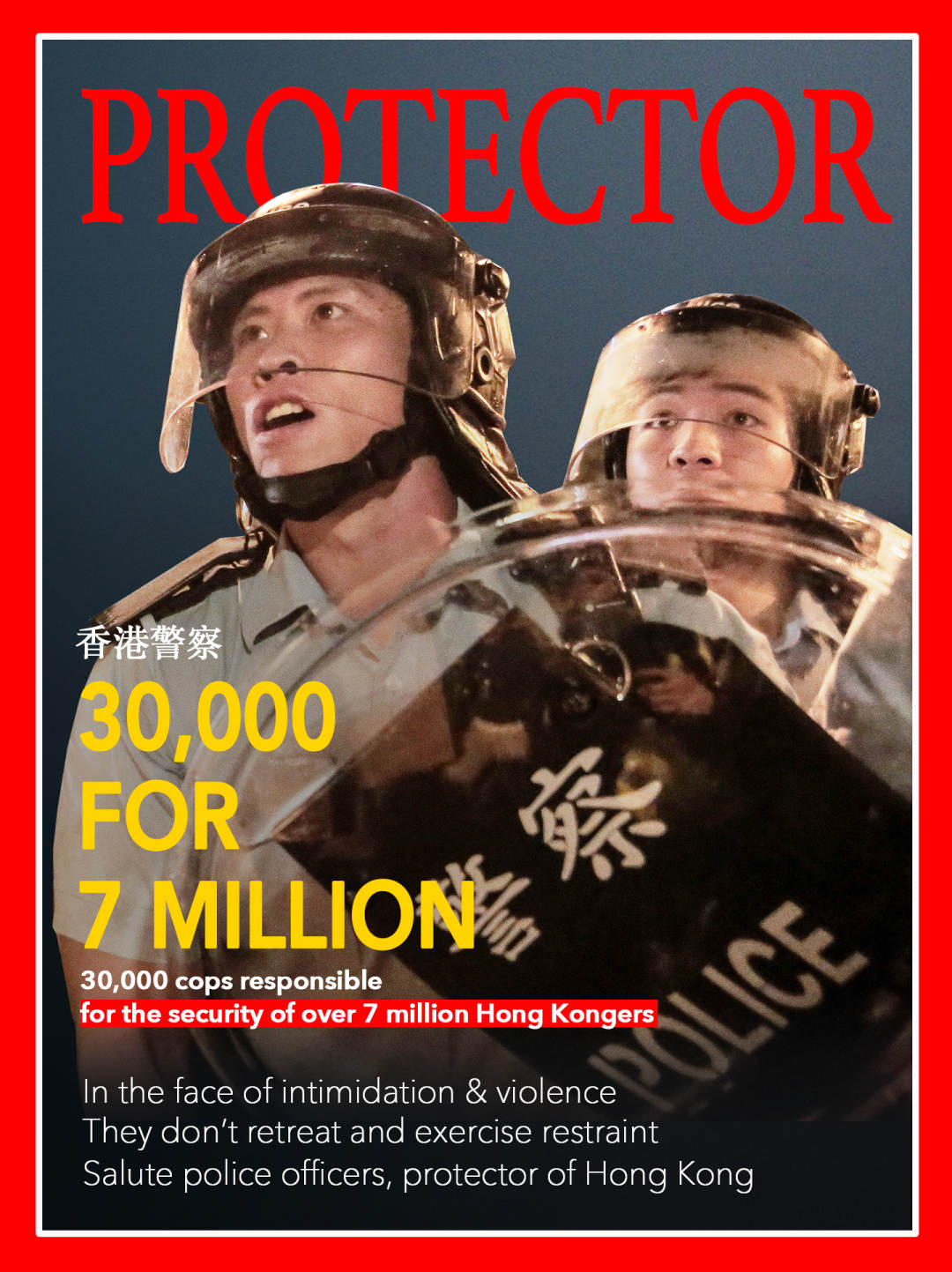 換個角度看,那些冒著生命危險、奮戰在止暴制亂一線的警察,又何嘗不是市民中的普通一員。換下警服,他們也不過是孩子的爸爸、父母的兒子、妻子的丈夫。而極端激進分子竟把他們侮辱為「狗」,無良教師咒罵他們的子女「活不過7歲」,暴徒直接用利器指向他們的脖頸……任何一個心有良知的香港市民,都不該容許這類毫無底線、挑戰人類基本價值的行徑再次發生。愛護香港警察,就是愛護我們自己。