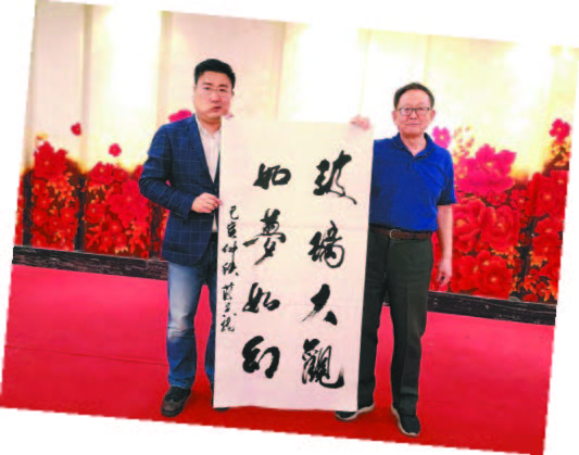 採風團團長蔣子龍(右)向集友玻璃有限公司董事總經理李業發贈送書法作品