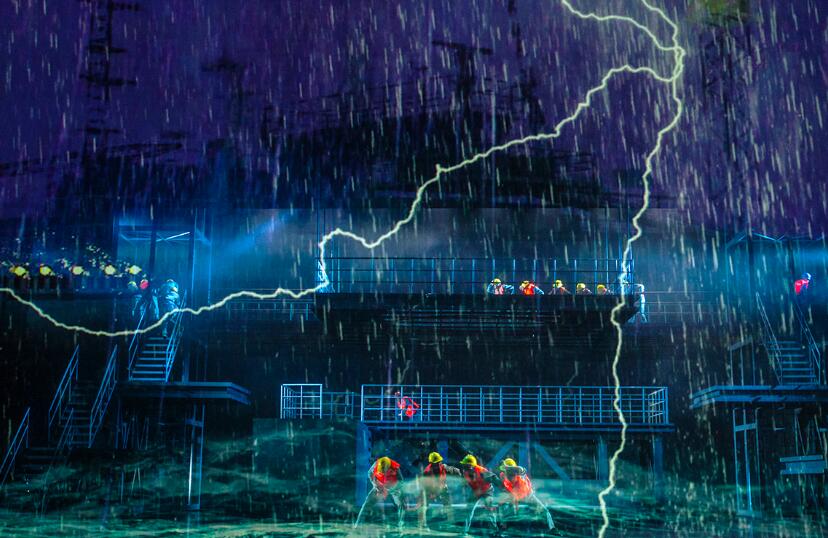 該集團首臺原創大型話劇《龍騰伶仃洋》也於當晚首演亮相。該劇聚焦港珠澳大橋建設工程,全景式塑造了建橋工人、技術人員、指揮協調群雕形象,是一部大工業題材的現實主義話劇作品。該劇選取了大橋建設中的典型事件,人工島上的颱風搶險,工程船上的困苦煎熬,大橋設計創始人員的堅守,沉管安裝的一波三折,大橋海底隧道最終完美接合等真實情節。通過講述建橋人如何克服重重困難、實現大橋順利竣工的感人故事,展現新時代建橋人的精神力量,謳歌當代中國所創造的世界建橋史上嶄新的偉大成就,生動而深刻地體現“一國兩制”三地攜手共進的同心協力和民族自信。